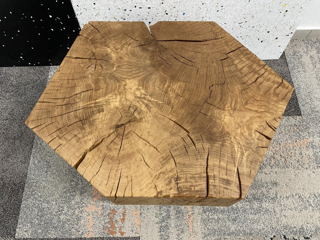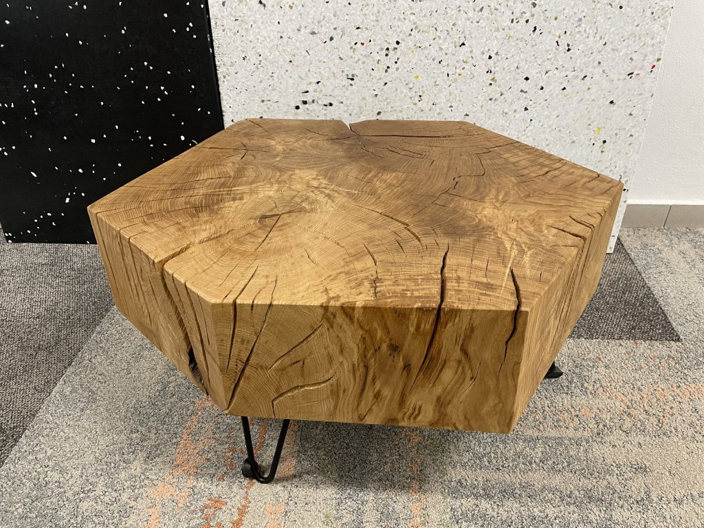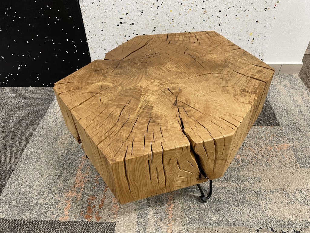 Tento dubový špalek/stolek je jako ten kamarád, který nikdy nemluví zbytečně, ale když už něco řekne, má to váhu. Doslova.