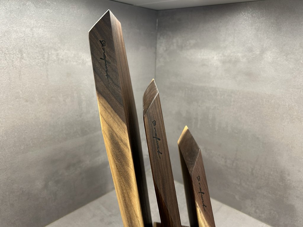 Představujeme vám kuchyňský set, který má větší charisma než většina televizních kuchařů. Tři prkénka z amerického ořechu – elegantní, odolná a tak krásná, že je budete chtít vystavit i v obýváku. A aby se necítila opuštěně, mají vlastní dřevěný stojánek, který je drží pohromadě jako malý kuchyňský orchestr.